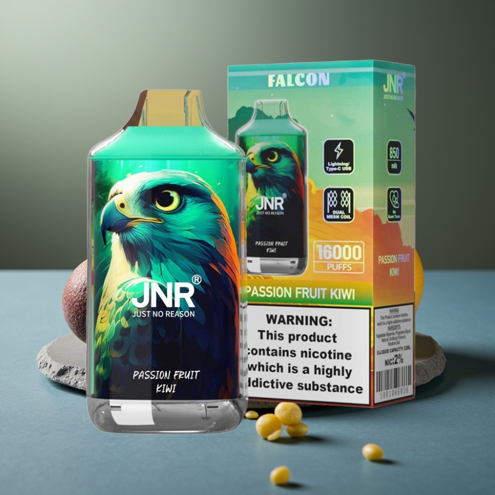 JNR Falcon 16000 Puffs Disposable Vape Passievrucht Kiwi – 850mAh, 22ml, Dual Mesh Coil, Type C/Lightning, LED Display, 0%/2% Nicotine